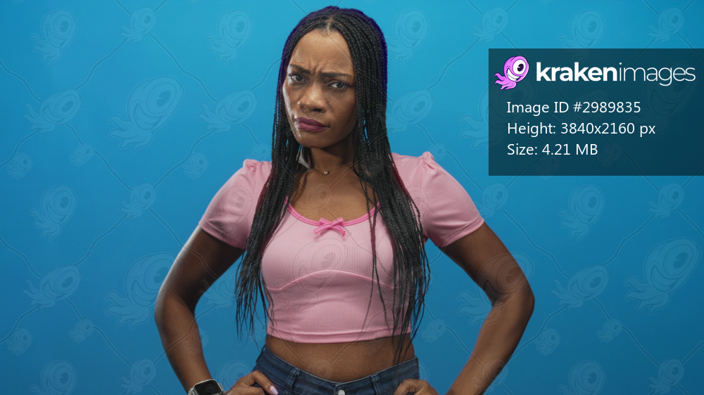 Woman pointing finger with hands on hips, cropped pink top showing midriff and braided hair against blue studio backdrop; disapproval.