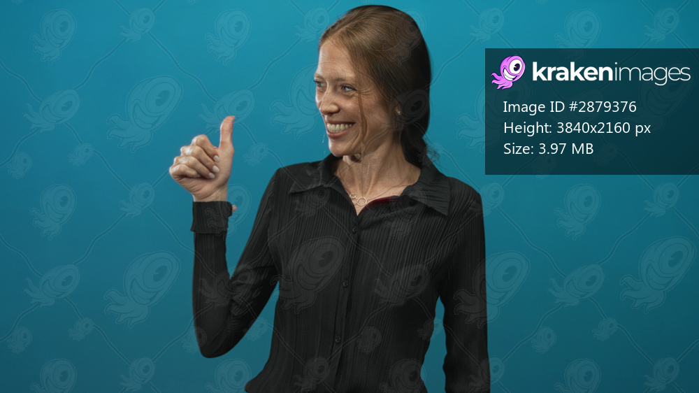 Woman pointing finger in blue studio, smiling and gesturing to the left while wearing a black blouse and necklace; friendly approachable joy.