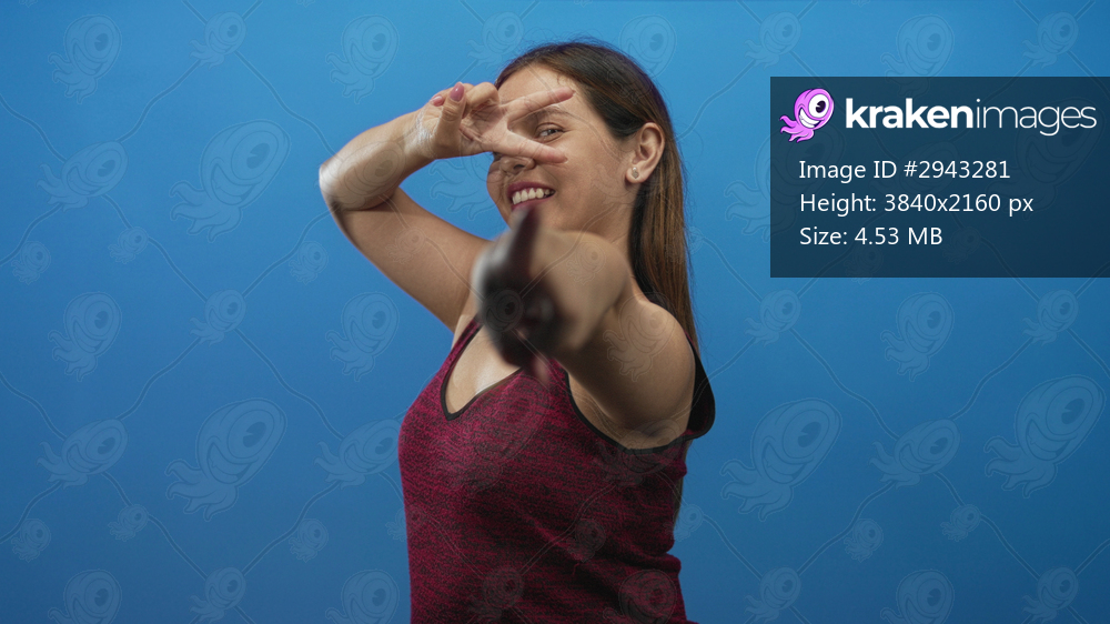 Woman pointing finger in studio with blue backdrop wearing maroon tank top with extended arm forward; playful.