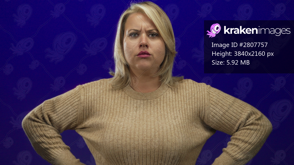 Woman pointing finger in studio setting wearing beige sweater with intense gaze and furrowed brow; disapproval.