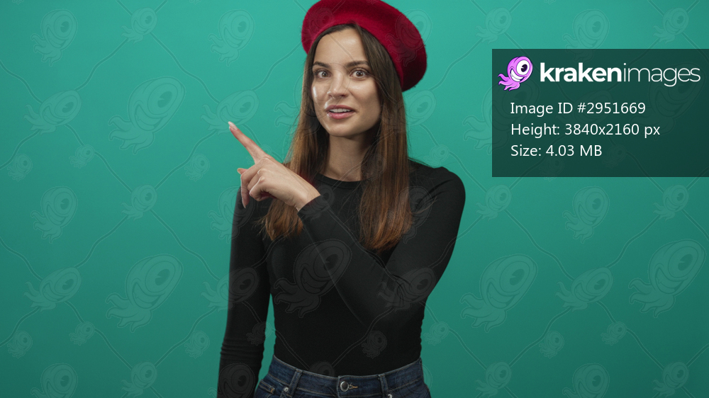 Woman pointing finger in studio with teal backdrop and red beret, gaze to side and open mouth; surprise attention alert.