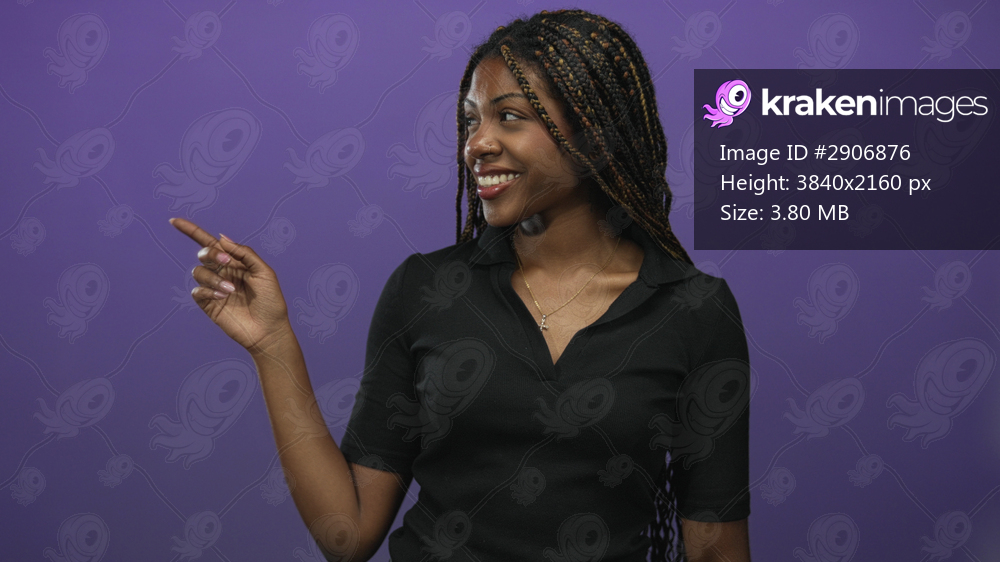 Woman pointing finger with left hand and making ok sign with right hand in purple studio wearing black polo; confidence approval positivity.