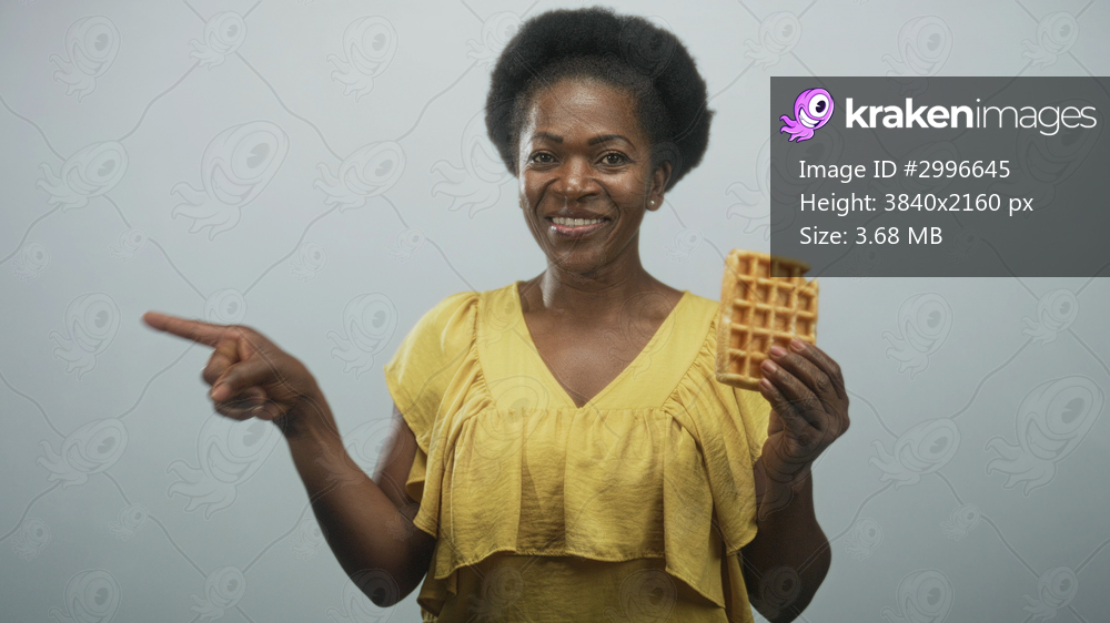 Woman pointing finger left while holding a waffle and smiling, visible hand and face centered in studio portrait; joy comfort.