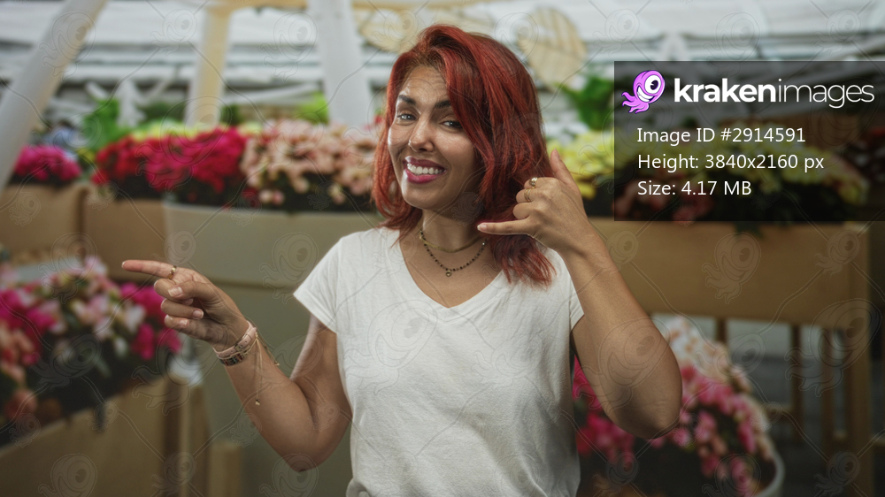 Woman pointing finger and making call gesture with bare hands among colorful flower stalls in market; cheerful invitation.