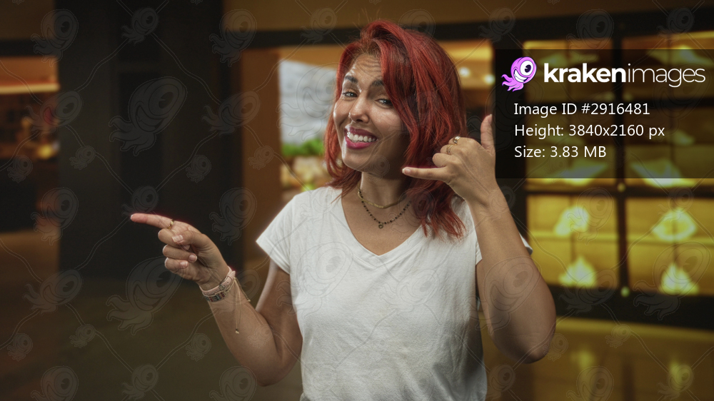 Woman pointing finger and making call hand gesture in a jewelry shop building while smiling toward glass showcase and pointing at display case; playful invitation. - Kraken Images