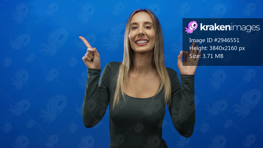 Woman pointing finger and making ok sign in a blue studio setting, smiling and facing camera; confidence approval.