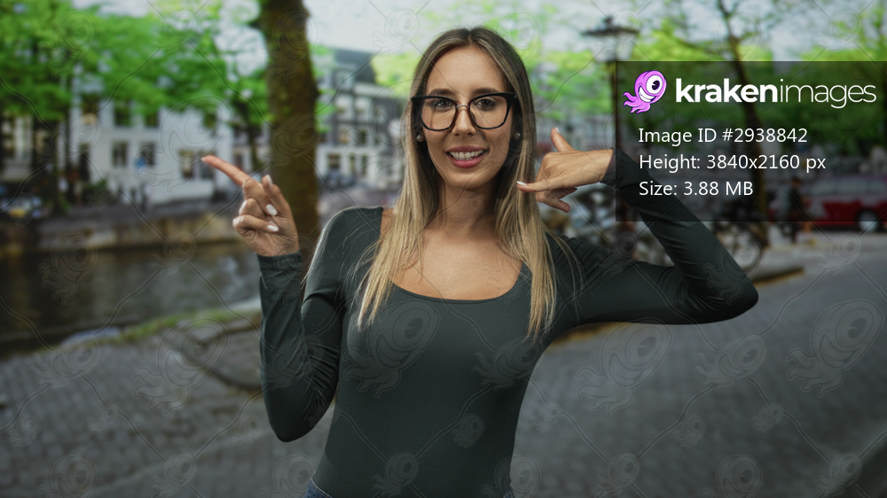 Woman pointing finger and making phone hand gesture on street by amsterdam canal, smiling with visible fingernails; friendly invitation.