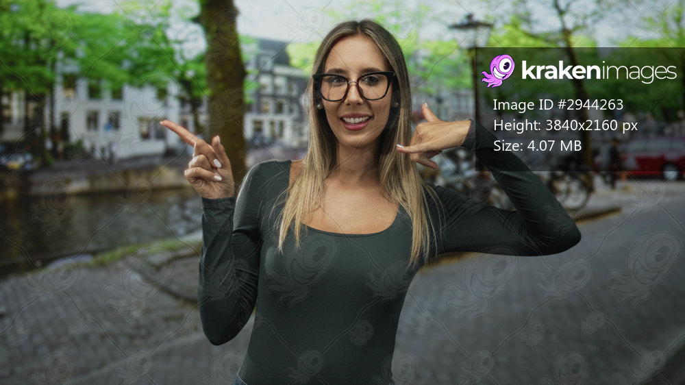 Woman pointing finger and making phone hand gesture on street by amsterdam canal, smiling with visible fingernails; friendly invitation.