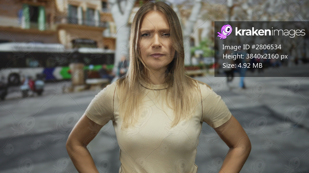 Woman pointing finger on busy city street, blonde hair, expressing anger outdoors with blurred background of pedestrians and trees in urban setting.