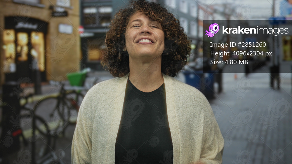 Woman pointing finger on busy city street lined with shops and brick buildings while smiling broadly; optimism.