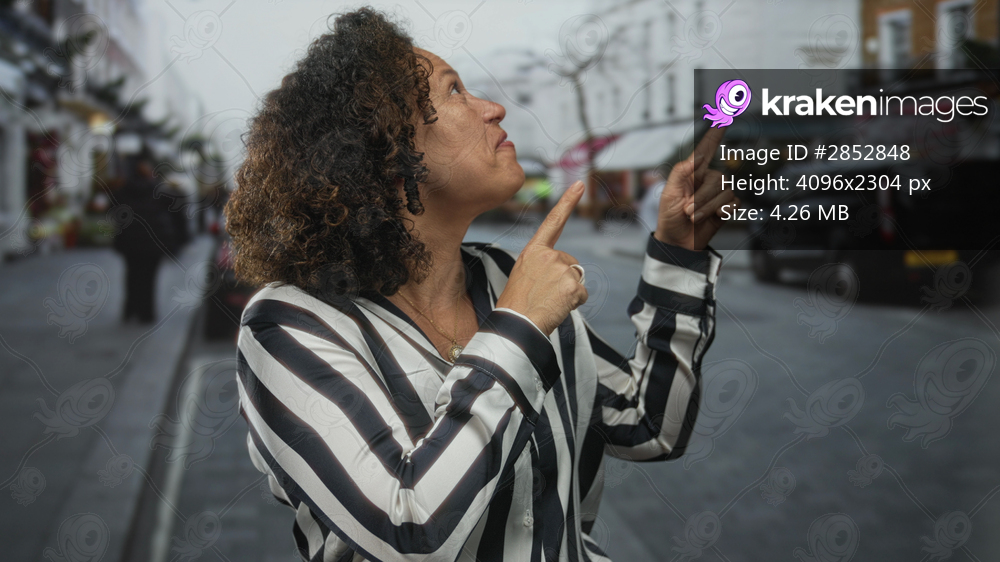 Woman pointing finger on busy city street lined with shops and parked vehicles near sidewalk under overcast sky; curiosity.