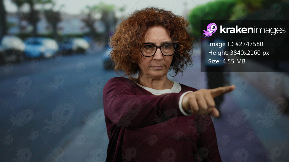 Woman pointing finger on city street with blurred cars and sidewalks in background, wearing glasses and maroon sweater, showcasing determination and focus in urban setting. - Kraken Images