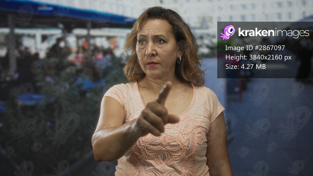 Woman pointing finger on crowded sunlit restaurant terrace with tables, umbrellas and potted plants; frustration.