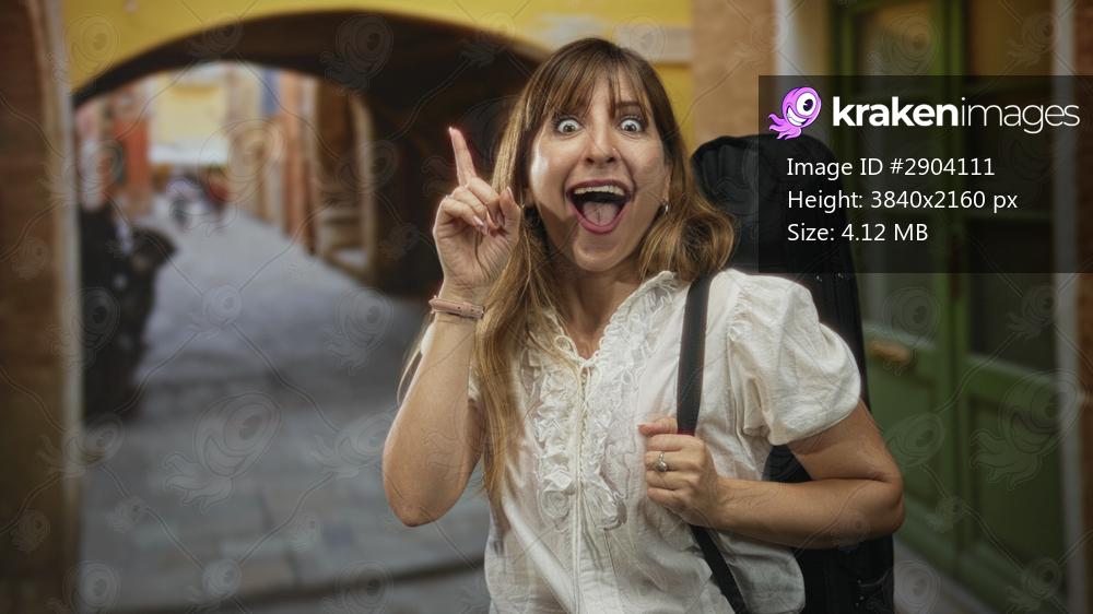Woman pointing finger on narrow street carrying guitar case strap over shoulder; excitement travel music.
