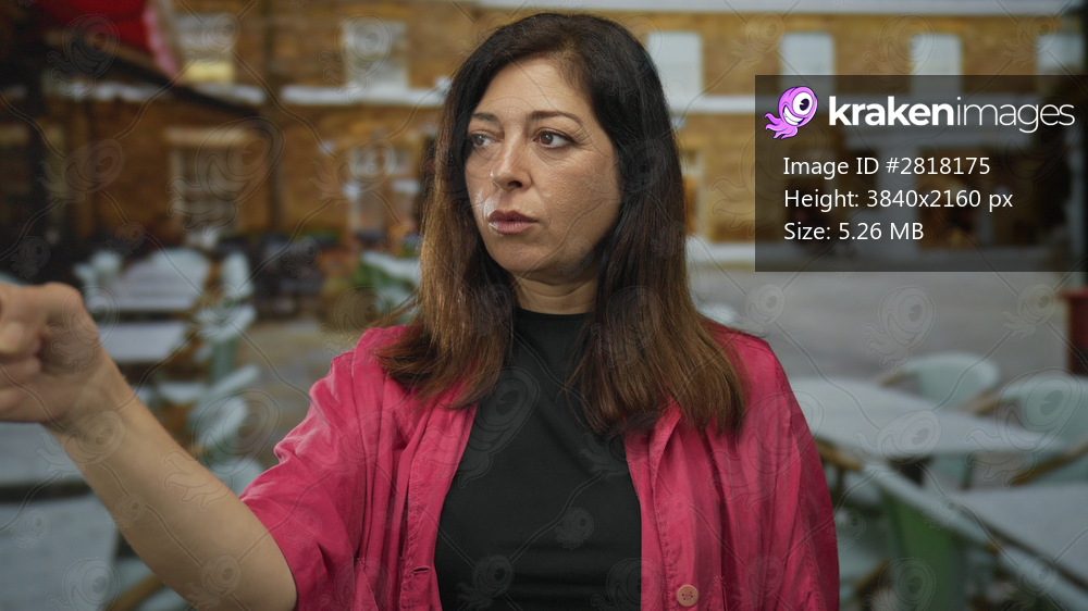 Woman pointing finger on restaurant terrace with serious expression and extended arm gesture; urgent warning.