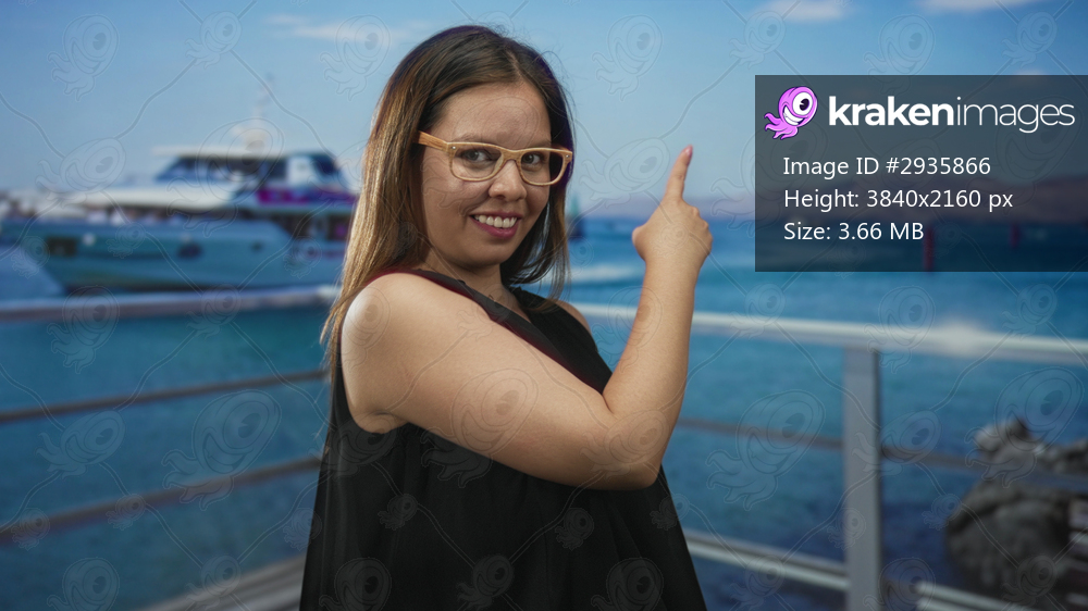 Woman pointing finger on street by the coast with yacht behind, glasses visible and bare arm raised; cheerful greeting.