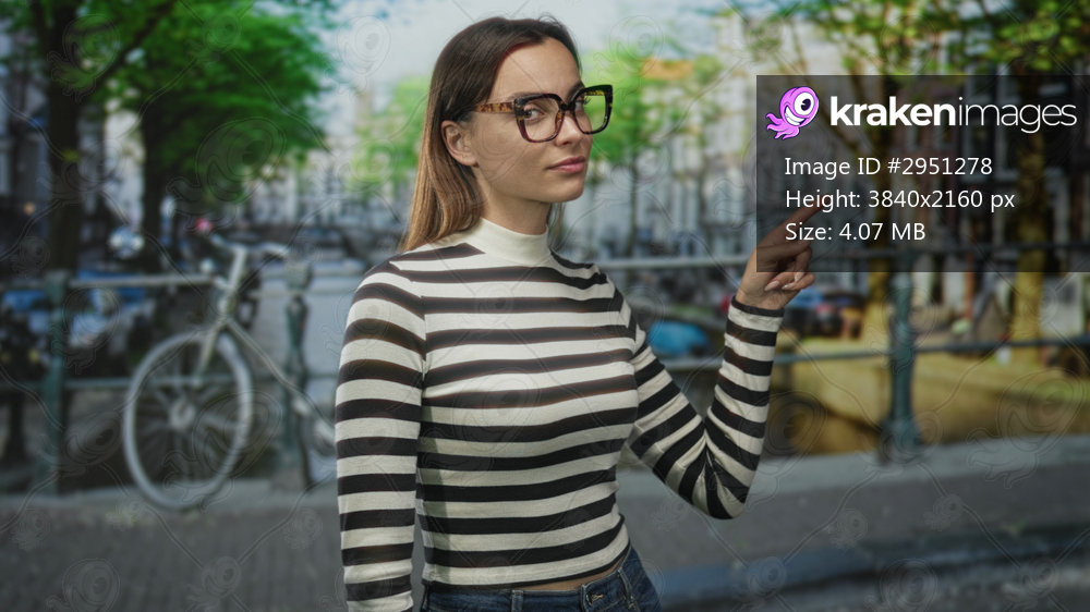 Woman pointing finger on street in amsterdam beside canal and bicycle, wearing striped top and glasses; confidence discovery.