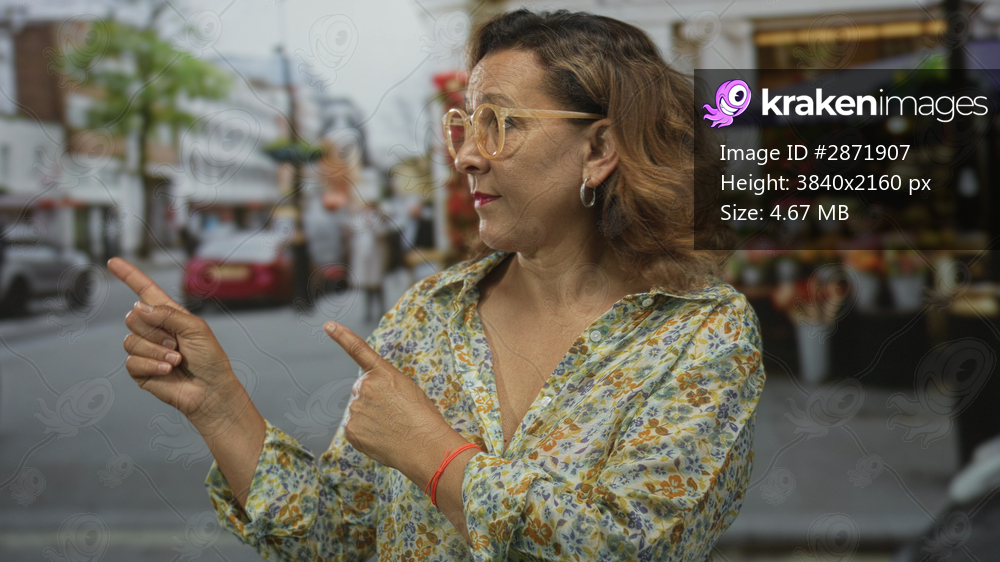 Woman pointing finger on street in front of flower stall wearing glasses and floral shirt amid blurred buildings and pedestrians; guidance.