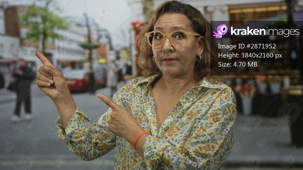 Woman pointing finger on street in front of flower stall wearing glasses and floral shirt amid blurred buildings and pedestrians; guidance.
