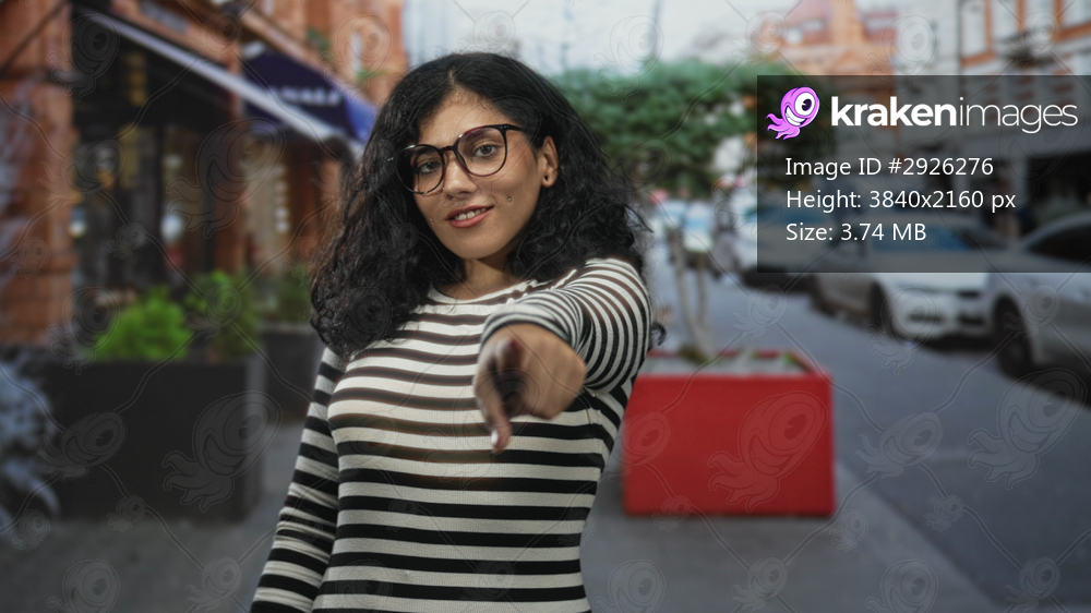 Woman pointing finger on street wearing glasses and striped shirt, direct gaze and lip piercing while reaching forward; bold confidence.