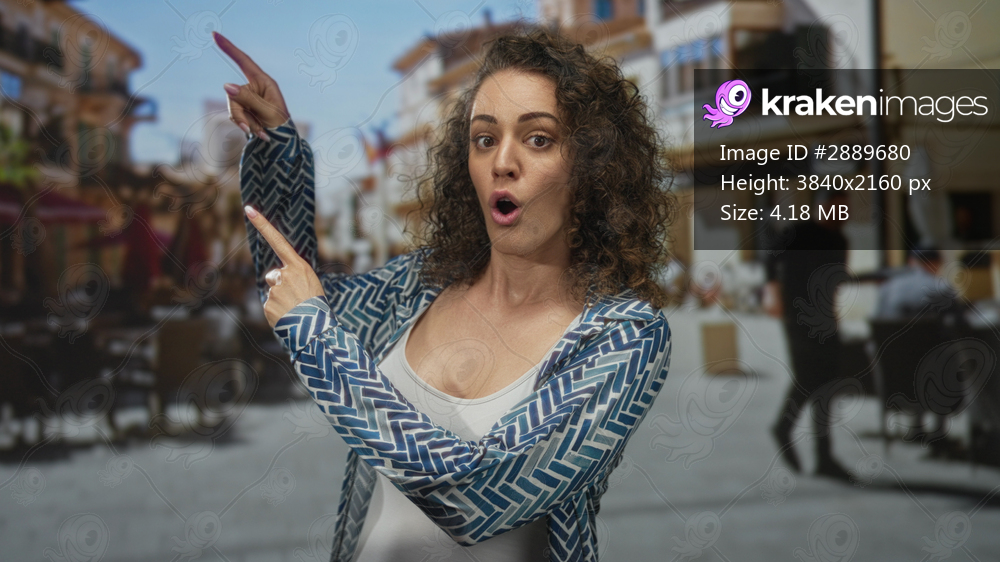 Woman pointing finger with open mouth on street near outdoor cafe tables and blurred pedestrians; surprise curiosity.