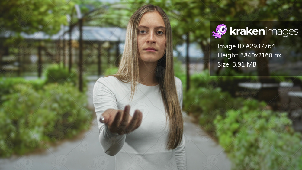 Woman pointing finger with outstretched hand on tree lined street pathway toward camera wearing white long sleeve shirt; determination.