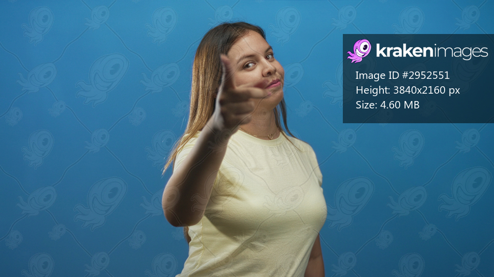Woman pointing finger with outstretched hand toward camera in studio setting; confidence empowerment challenge.