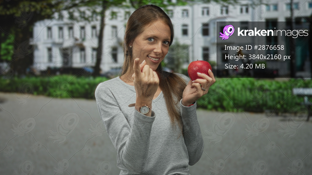 Woman pointing finger with outstretched hand while holding a red apple on a city street near buildings; playful invitation.