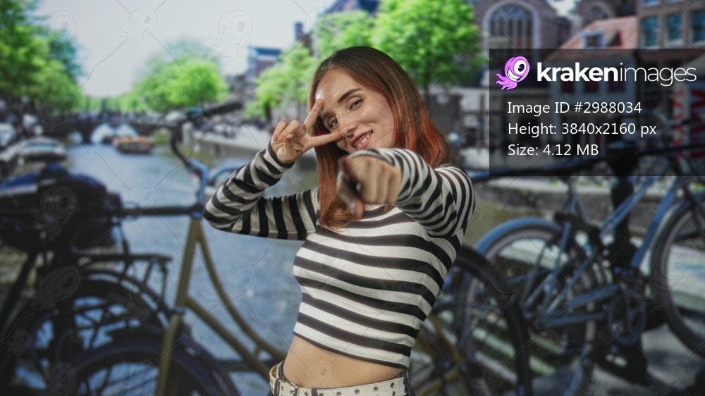 Woman pointing finger with peace v near eye at camera, bicycles by canal on a street bridge; playful confidence.