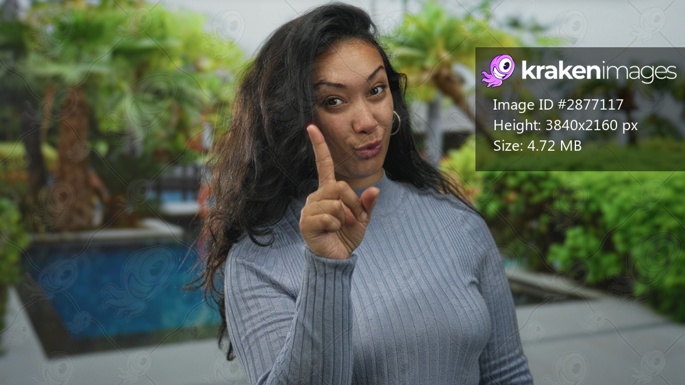 Woman pointing finger and showing peace sign near eye at hotel poolside by resort greenery; playful.