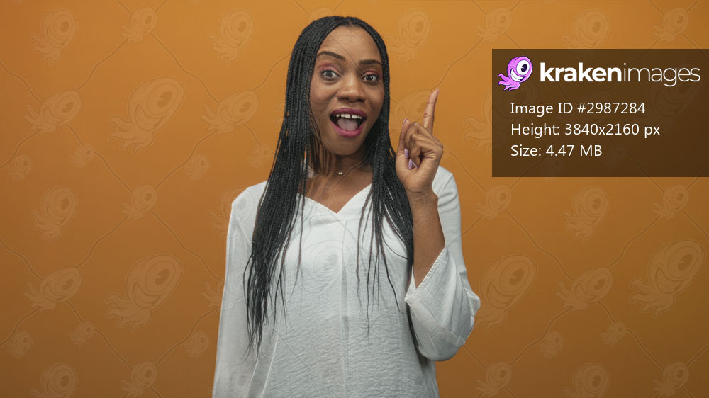 Woman pointing finger and smiling with visible teeth in studio, wearing white shirt and braided hair; playful confidence.
