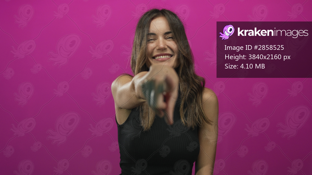 Woman pointing finger straight at camera in a studio setting with a direct gaze and focused stance; confidence.