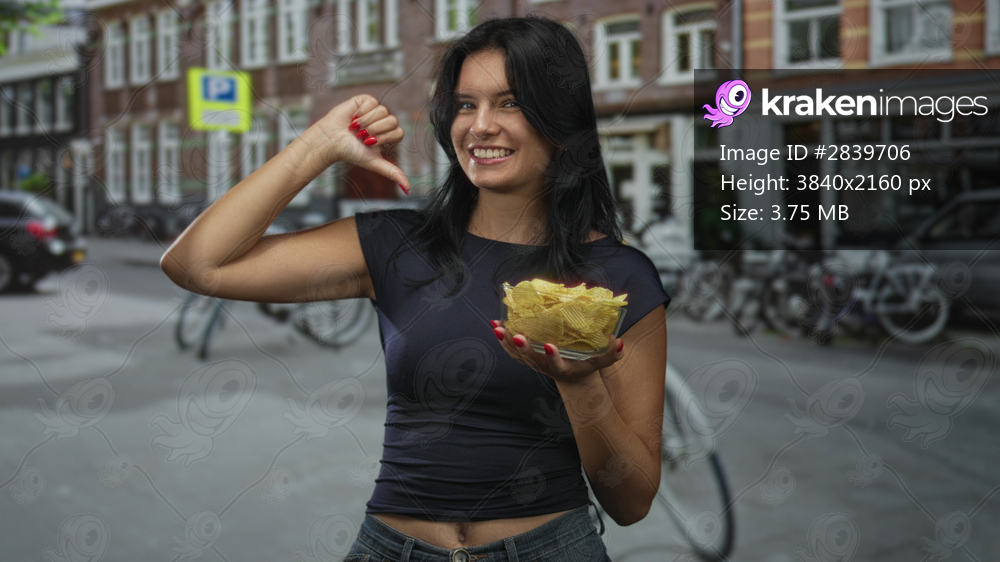 Woman pointing finger to a bowl of chips while showing her exposed midriff on a city street; indulgence.