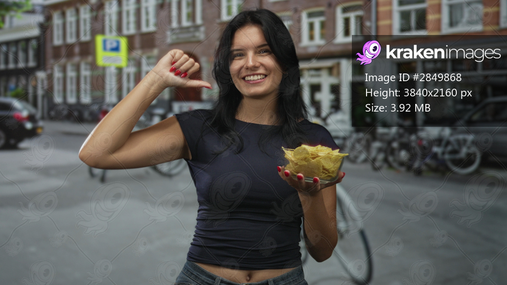 Woman pointing finger to a bowl of chips while showing her exposed midriff on a city street; indulgence.