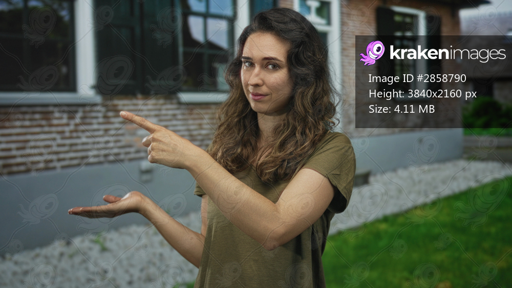 Woman pointing finger to brick building entrance with relaxed posture and visible bare arm; curiosity.