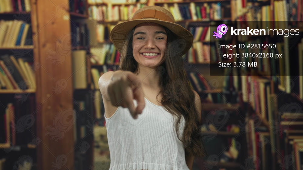 Woman pointing finger to camera in library building wearing a bright straw hat and white tank top; excitement.