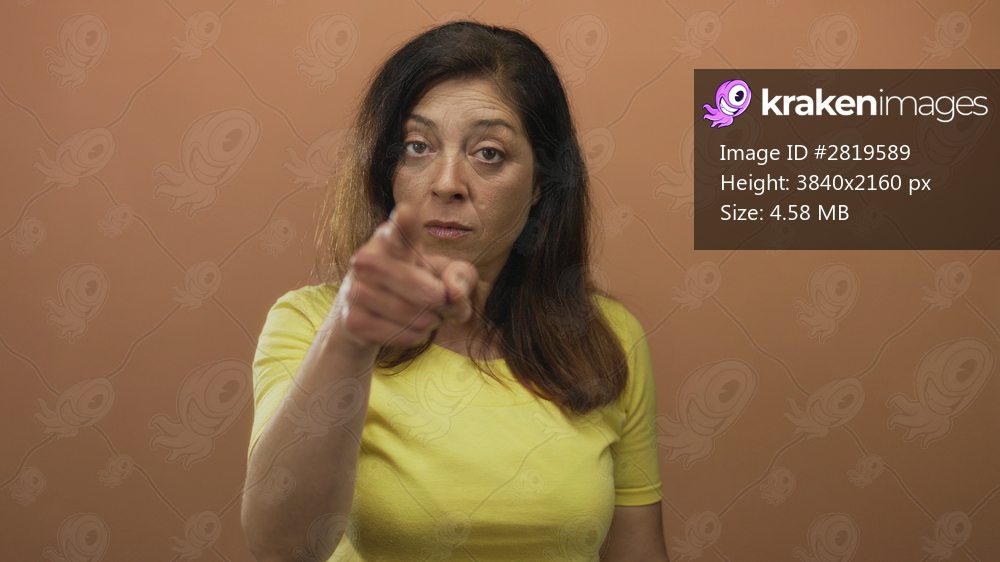 Woman pointing finger to camera in peach studio with stern expression; firm command authority urgency.