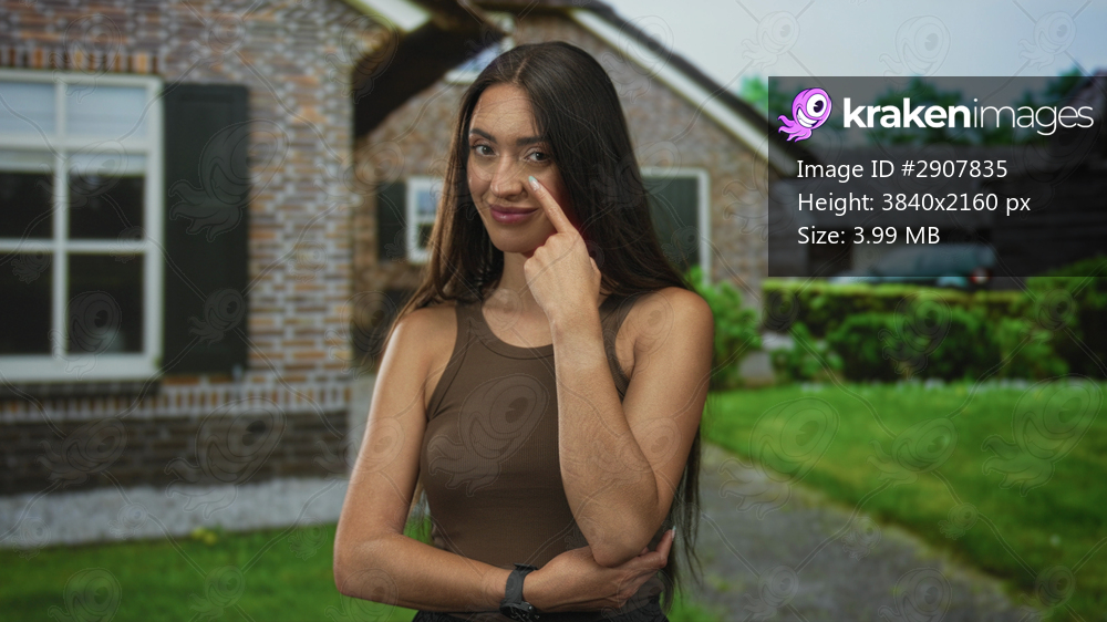 Woman pointing finger to cheek at building entrance near house doorway, arms crossed and smiling in outdoor yard; playful.