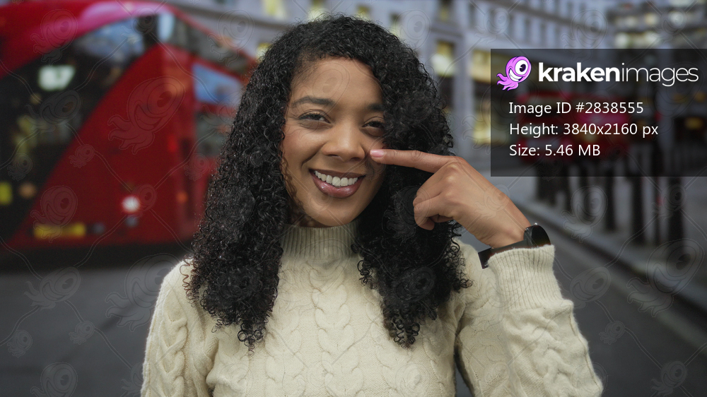 Woman pointing finger to cheek on busy city street amid urban traffic with red bus; joy confidence optimism warmth.