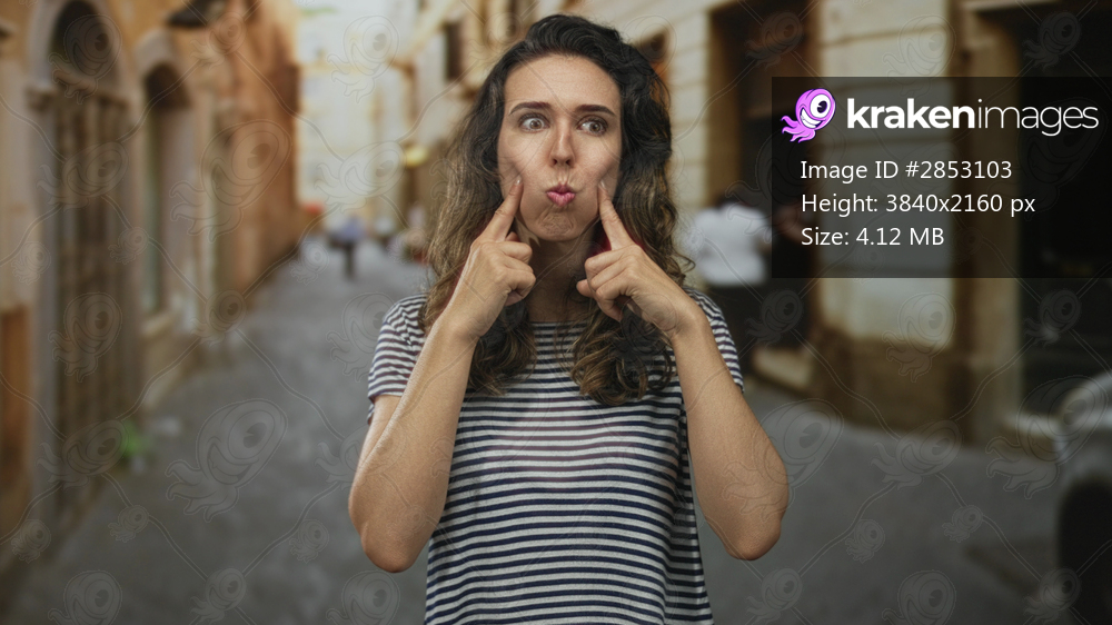 Woman pointing finger to cheeks against a sunlit old town street with curious expression; playful mischief.