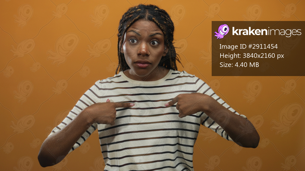 Woman pointing finger to chest in orange studio wearing striped shirt and braided hair with puzzled wide eyed expression; self doubt.