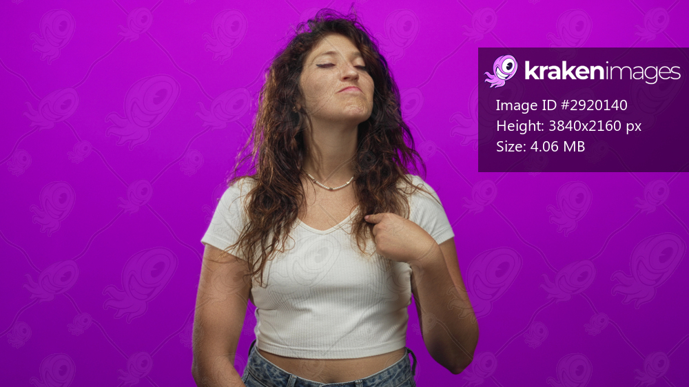 Woman pointing finger to chest wearing white crop top and pearl necklace in purple studio; confidence.