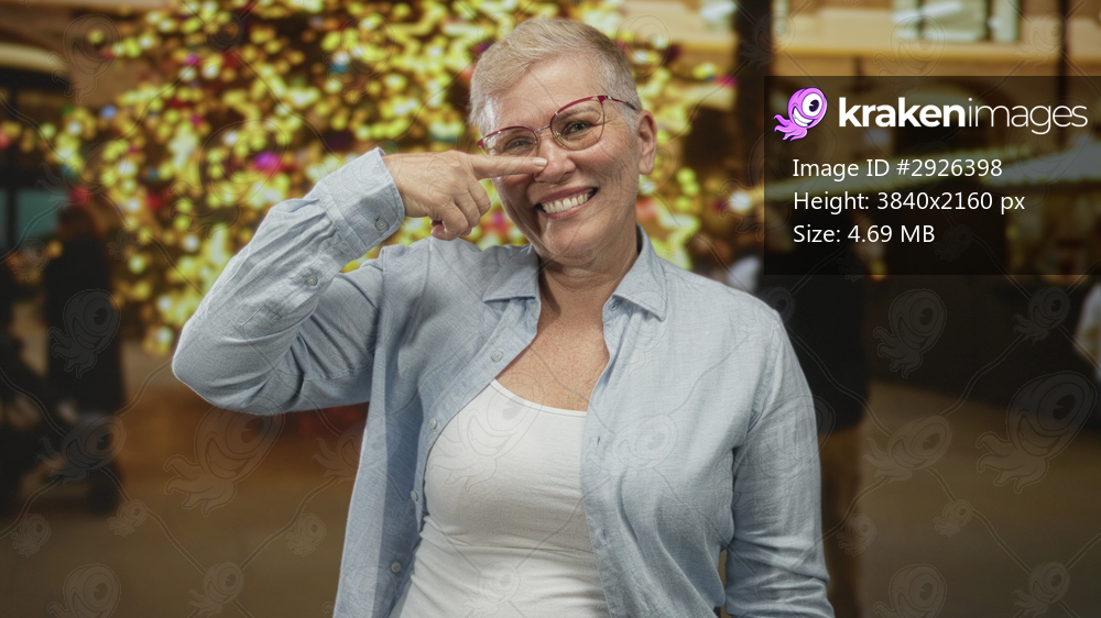 Woman pointing finger to chest while smiling in a building with decorated christmas tree and twinkling lights; holiday joy.