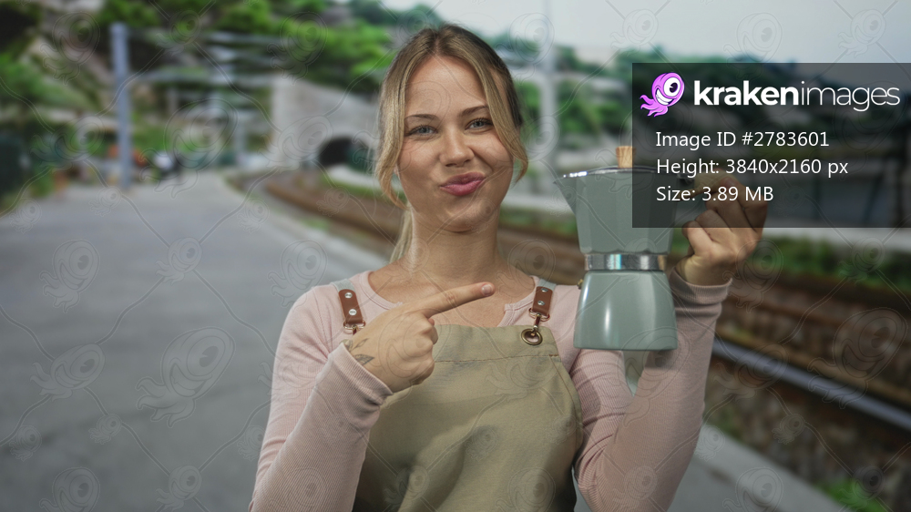 Woman pointing finger to coffeemaker at railway station; morning ritual, caffeine boost, welcoming invitation.