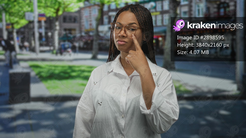 Woman pointing finger to eye on busy city street wearing glasses and white button shirt with braided hair, looking directly ahead; confidence.