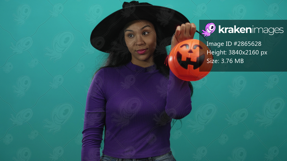 Woman pointing finger to halloween pumpkin bucket wearing witch hat and purple sweater in teal studio; playfulness.