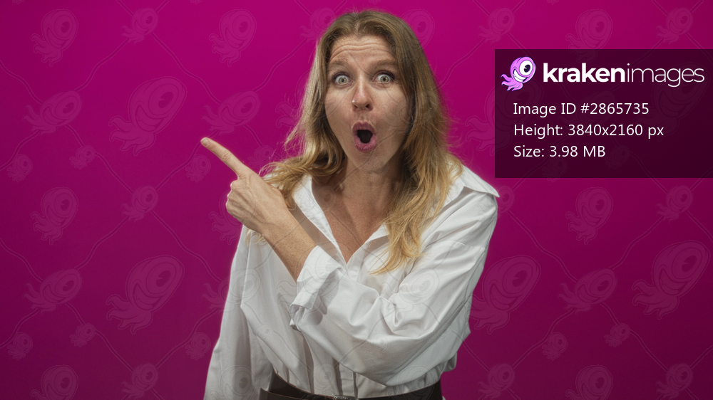 Woman pointing finger to left with open mouth and raised eyebrow, wearing white shirt belted at waist in studio by magenta wall; surprise.