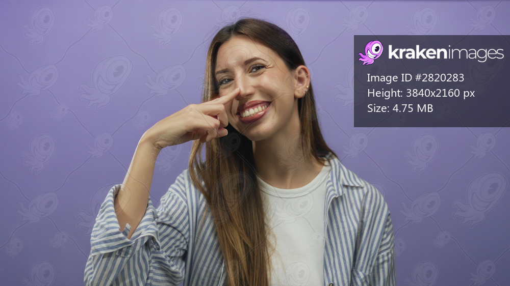Woman pointing finger to nose in purple studio setting wearing striped shirt and white top while smiling subtly and tilting head lightly; playfulness.