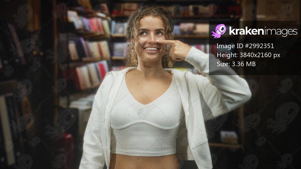 Woman pointing finger to nose and smiling in a bookstore aisle inside a building, wearing white crop top and open hoodie with visible midriff; playful warmth. - Kraken Images