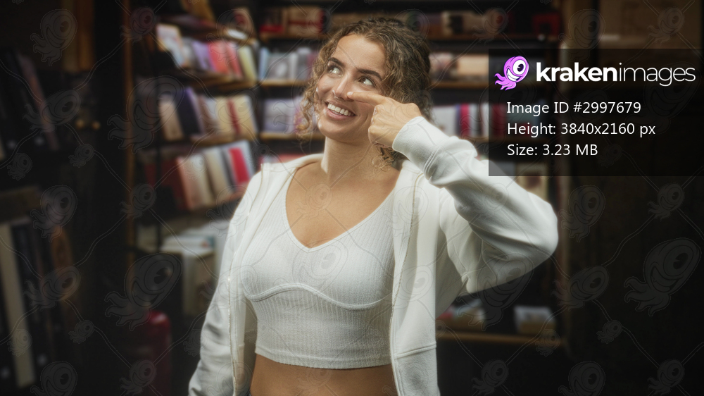 Woman pointing finger to nose and smiling in a bookstore aisle inside a building, wearing white crop top and open hoodie with visible midriff; playful warmth. - Kraken Images